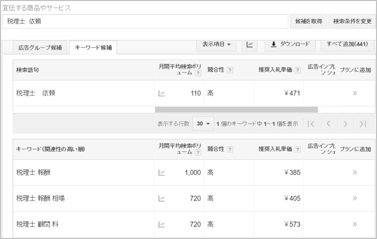 上図でいうと「税理士 顧問料」というのが候補キーワードです。